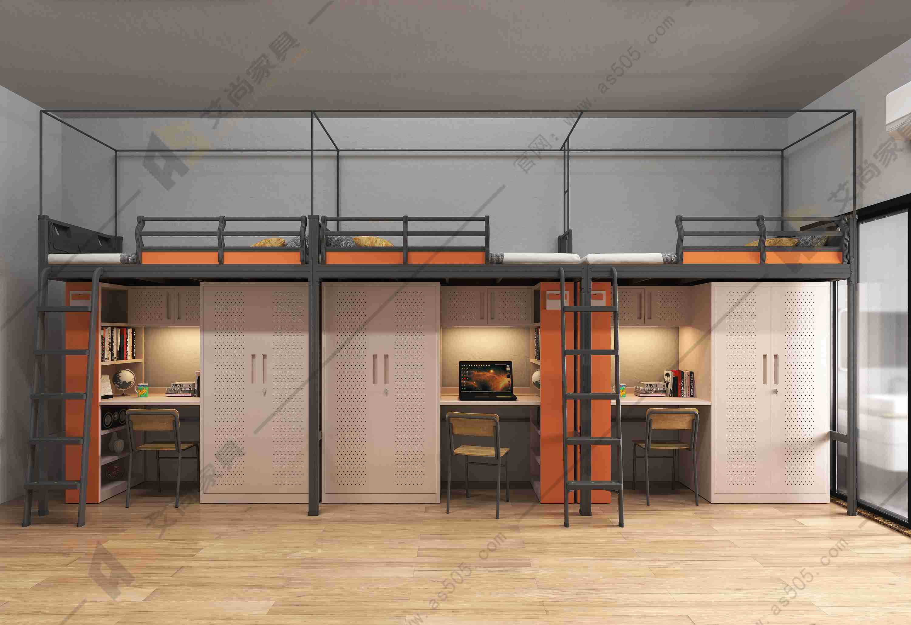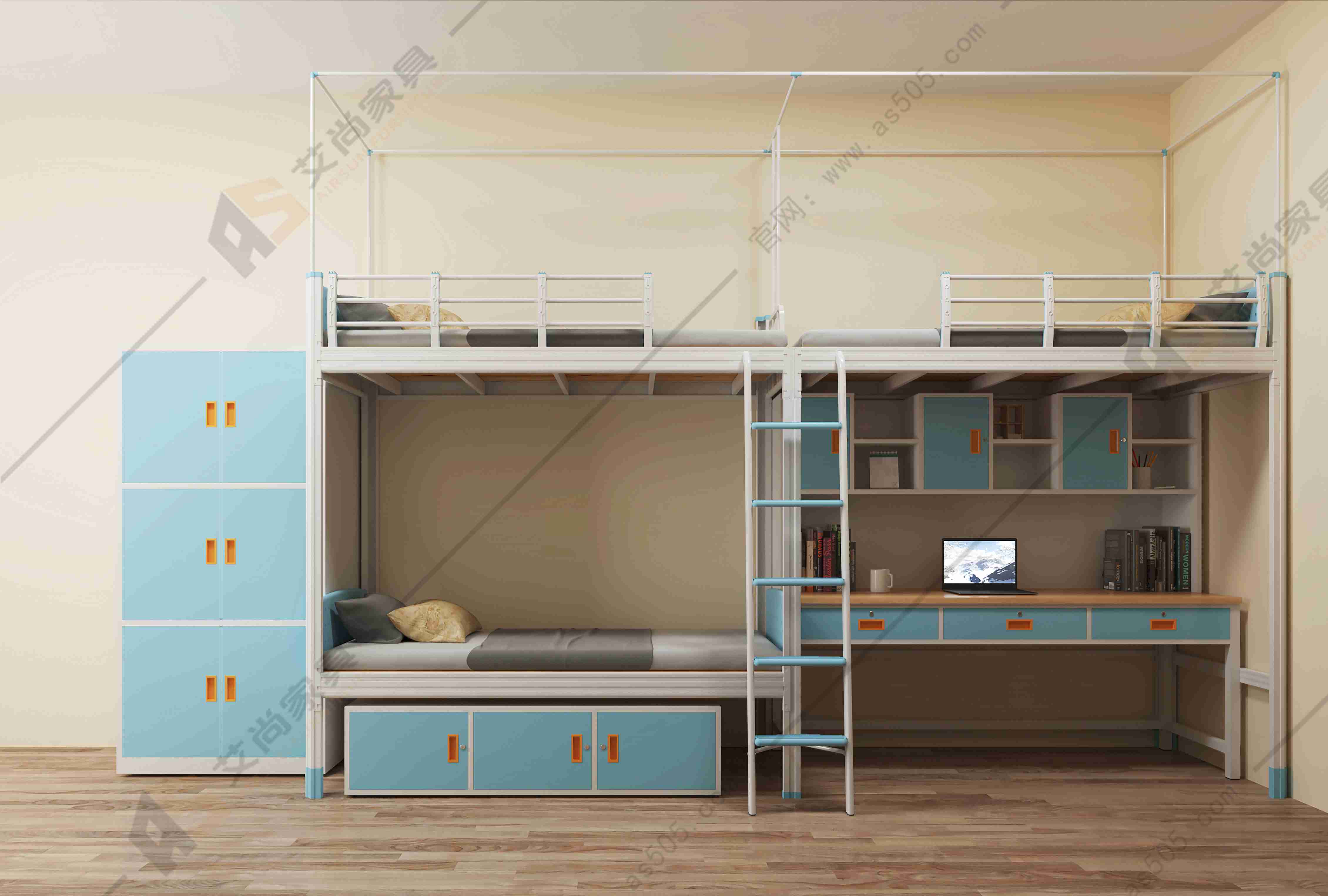 2. 空間利用:桌柜一體公寓床的設(shè)計旨在利用空間,尤其適合空間有限的宿舍房間。床下通常設(shè)計有柜子和儲物空間,可以方便地存放物品。艾尚家具還設(shè)計的有很多貼心小細節(jié),設(shè)計床簾桿、鞋架。而高低上下鐵床通過垂直布局,在一張床上可以安置多個床位,適合需要多人共用空間的場合。