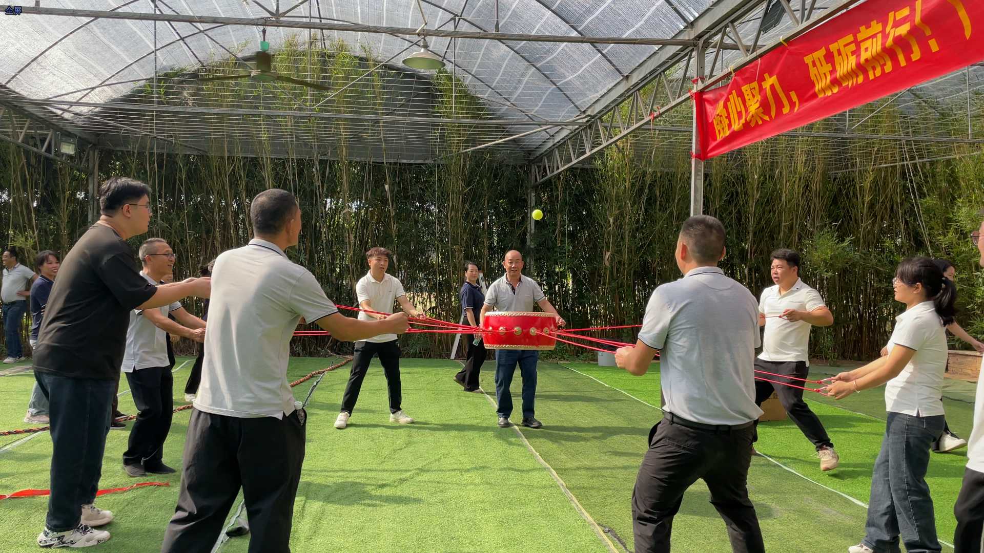 如果說拔河是力量的爆發(fā),那么“鼓動人心”則是默契的考驗。十人一組,牽拉一面同心鼓,目光緊隨那顆跳動的網(wǎng)球。“一、二、三……”大家通過不斷的微調(diào),控制著球的起落。