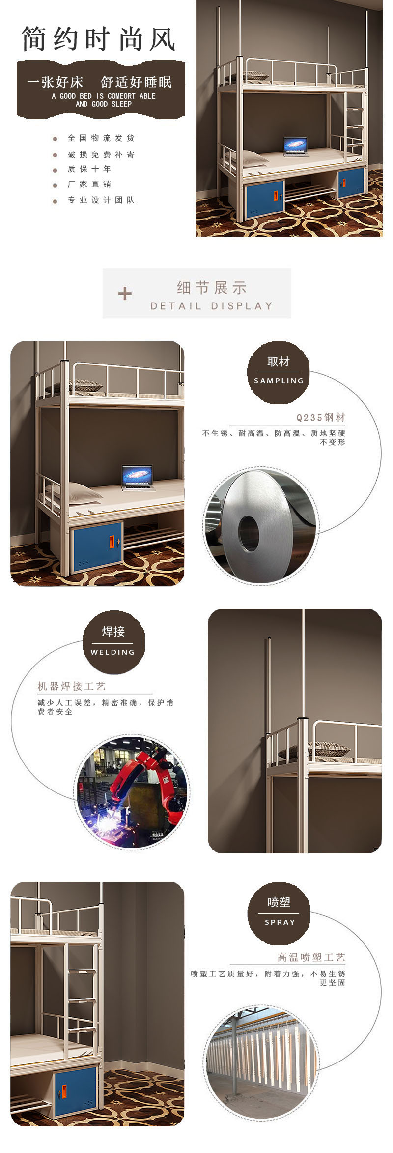 床架結(jié)構(gòu)穩(wěn)固不易變形,承重力好,床體承重力達500KG 根據(jù)人體工程學(xué)設(shè)計,上下舒適自如!
