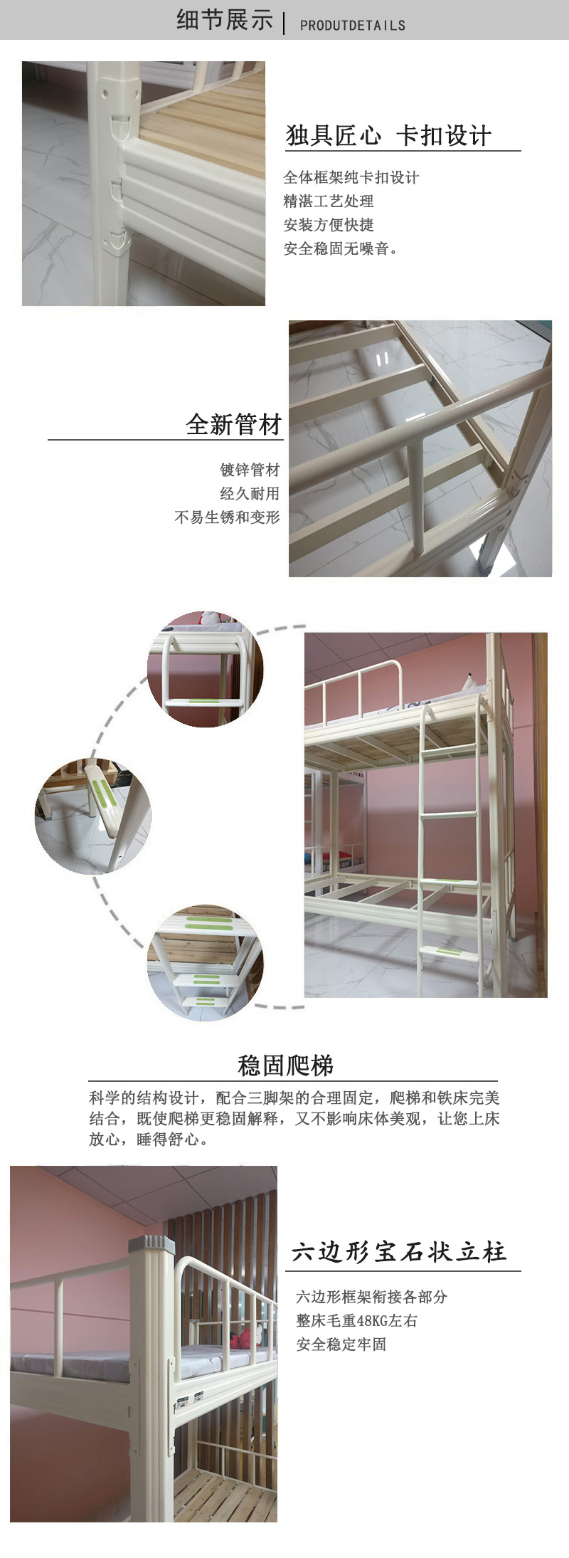 上下鋪鐵床表面全自動噴粉處理,0甲醛;中空異型結構,卡扣式連接、無螺絲;100%冷軋鋼板不參假。真正的良心企業(yè)!