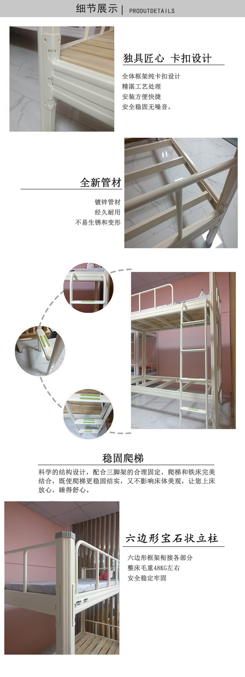 產(chǎn)品介紹: 兩連體三人位中梯上下鋪雙層床,常規(guī)尺寸4480長(zhǎng)*900寬*2100高mm(尺寸可根據(jù)客戶要求定制),本產(chǎn)品顏色使用米白色、木紋黃(顏色可按照客戶喜好定制),原材料使用1.2mm冷軋鋼板,產(chǎn)品包裝采用紙箱防止運(yùn)輸途中磨損,產(chǎn)品適用于企業(yè)、單位、工廠6人間宿舍均可適用。 本產(chǎn)品廠家質(zhì)保十年!